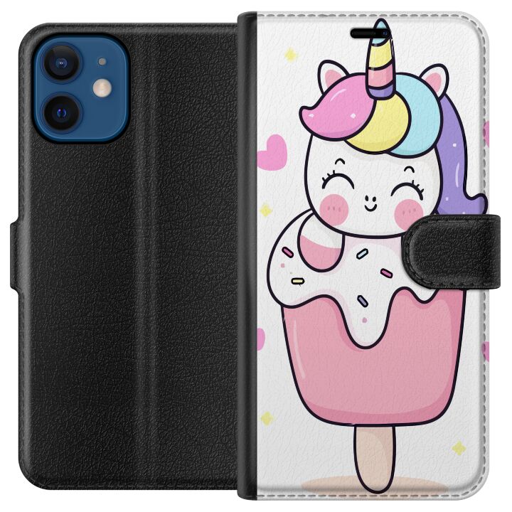 Plånboksfodral för iPhone 12 med Glad enhörning -design. Fodralet kombinerar stil och funktion – ett slitstarkt mobilskal som skyddar mot repor och stötar samt praktiska kortfack på insidan.