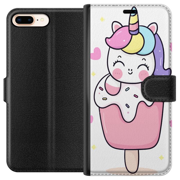 Plånboksfodral för iPhone 7 Plus med Glad enhörning -design. Fodralet kombinerar stil och funktion – ett slitstarkt mobilskal som skyddar mot repor och stötar samt praktiska kortfack på insidan.