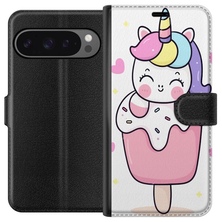 Plånboksfodral för Pixel 9 Pro XL med Glad enhörning -design. Fodralet kombinerar stil och funktion – ett slitstarkt mobilskal som skyddar mot repor och stötar samt praktiska kortfack på insidan.