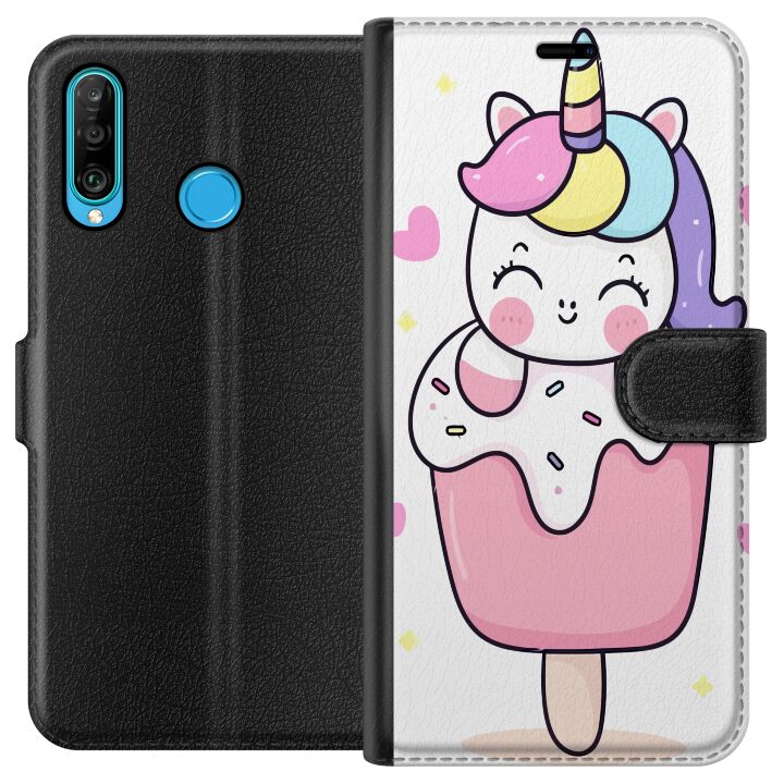Plånboksfodral för P30 lite med Glad enhörning -design. Fodralet kombinerar stil och funktion – ett slitstarkt mobilskal som skyddar mot repor och stötar samt praktiska kortfack på insidan.