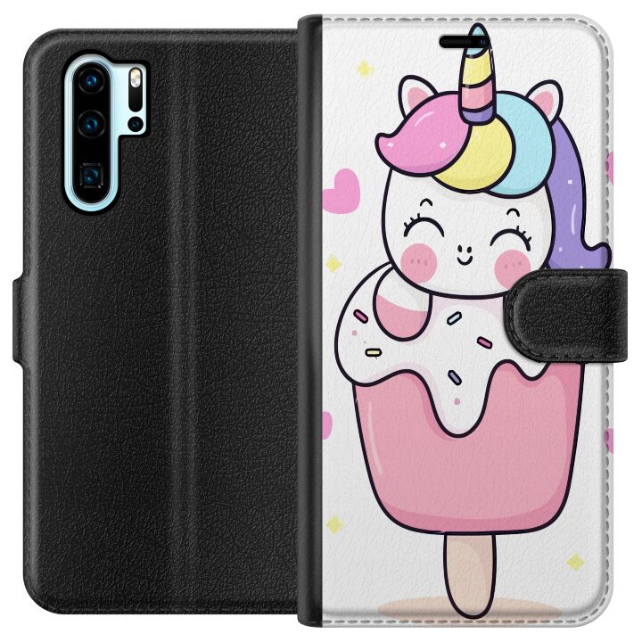 Plånboksfodral för P30 Pro med Glad enhörning -design. Fodralet kombinerar stil och funktion – ett slitstarkt mobilskal som skyddar mot repor och stötar samt praktiska kortfack på insidan.