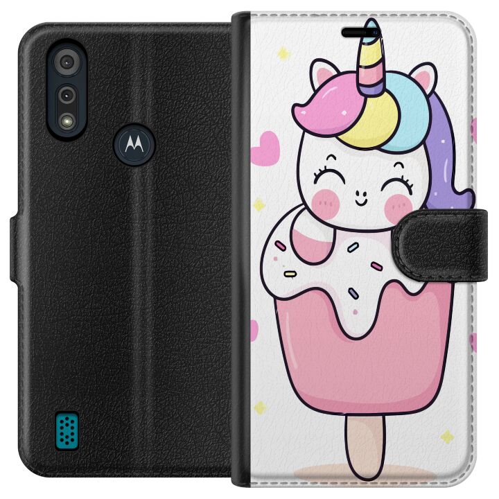 Plånboksfodral för Moto E6i med Glad enhörning -design. Fodralet kombinerar stil och funktion – ett slitstarkt mobilskal som skyddar mot repor och stötar samt praktiska kortfack på insidan.