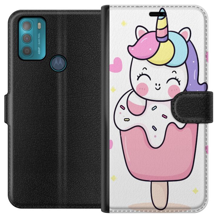 Plånboksfodral för Moto G50 med Glad enhörning -design. Fodralet kombinerar stil och funktion – ett slitstarkt mobilskal som skyddar mot repor och stötar samt praktiska kortfack på insidan.