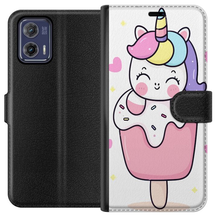 Plånboksfodral för Moto G73 med Glad enhörning -design. Fodralet kombinerar stil och funktion – ett slitstarkt mobilskal som skyddar mot repor och stötar samt praktiska kortfack på insidan.