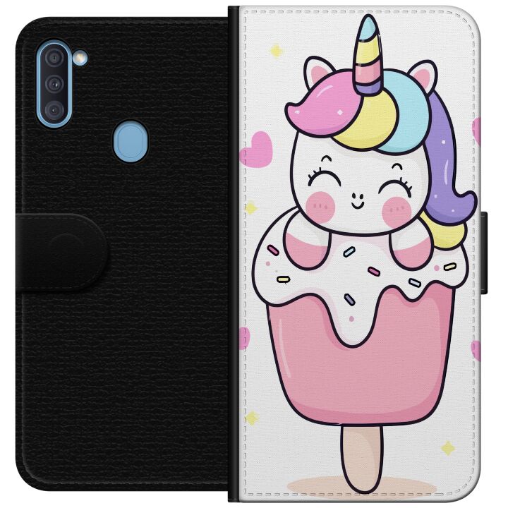 Plånboksfodral för Galaxy A11 med Glad enhörning -design. Fodralet kombinerar stil och funktion – ett slitstarkt mobilskal som skyddar mot repor och stötar samt praktiska kortfack på insidan.