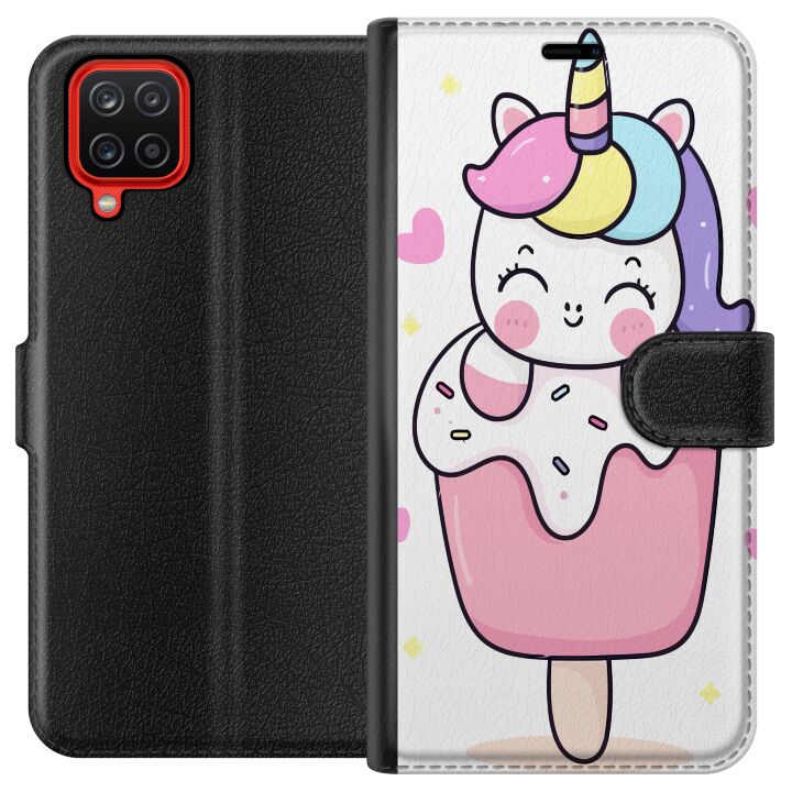 Plånboksfodral för Galaxy A12 med Glad enhörning -design. Fodralet kombinerar stil och funktion – ett slitstarkt mobilskal som skyddar mot repor och stötar samt praktiska kortfack på insidan.