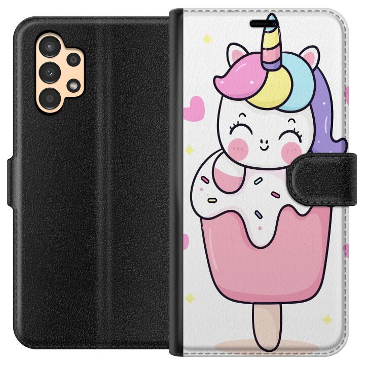 Plånboksfodral för Galaxy A13 med Glad enhörning -design. Fodralet kombinerar stil och funktion – ett slitstarkt mobilskal som skyddar mot repor och stötar samt praktiska kortfack på insidan.