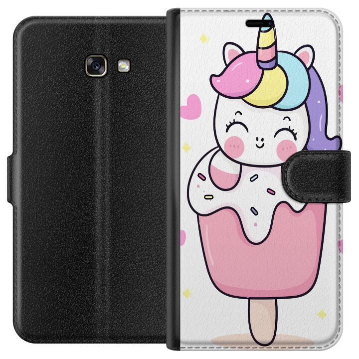 Plånboksfodral för Galaxy A3 (2017) med Glad enhörning -design. Fodralet kombinerar stil och funktion – ett slitstarkt mobilskal som skyddar mot repor och stötar samt praktiska kortfack på insidan.