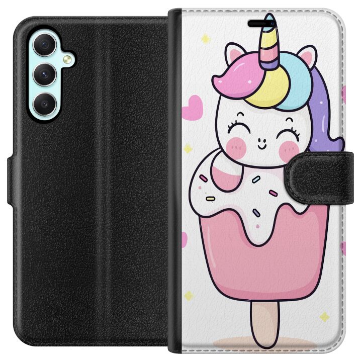 Plånboksfodral för Galaxy A34 med Glad enhörning -design. Fodralet kombinerar stil och funktion – ett slitstarkt mobilskal som skyddar mot repor och stötar samt praktiska kortfack på insidan.