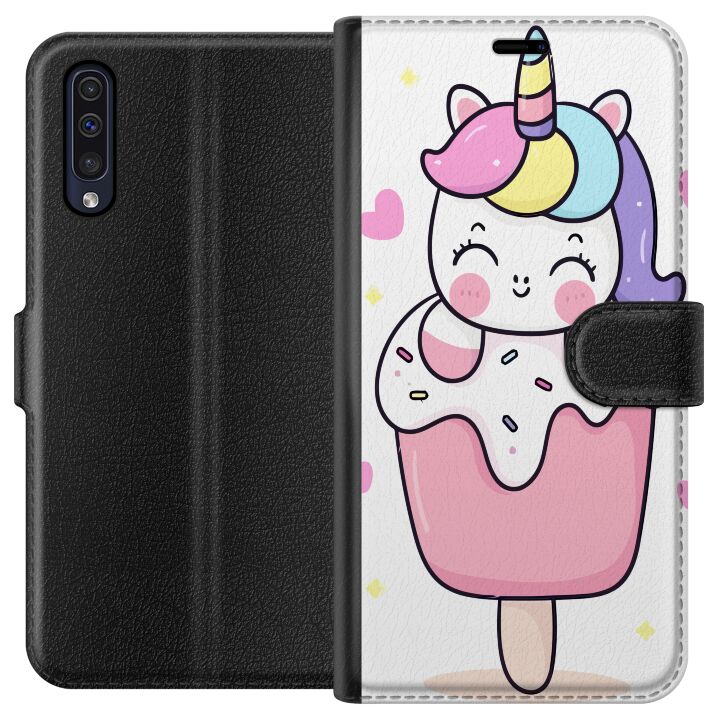 Plånboksfodral för Galaxy A50 med Glad enhörning -design. Fodralet kombinerar stil och funktion – ett slitstarkt mobilskal som skyddar mot repor och stötar samt praktiska kortfack på insidan.