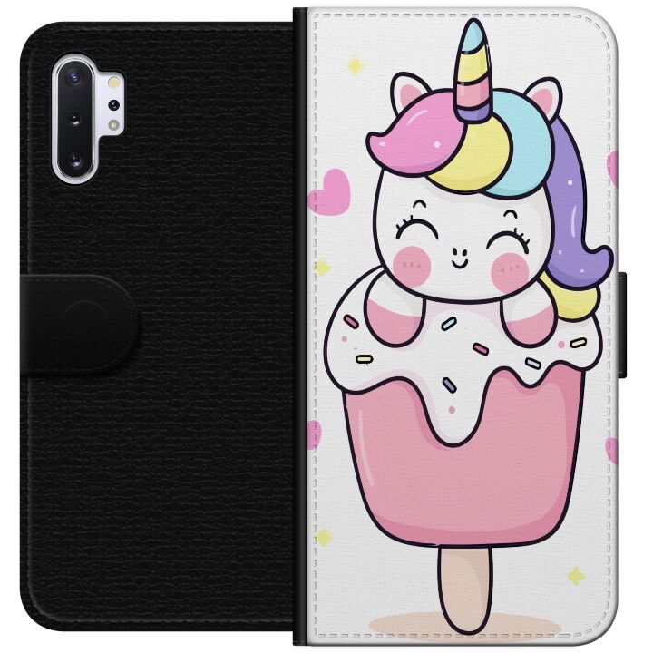 Plånboksfodral för Galaxy Note10+ med Glad enhörning -design. Fodralet kombinerar stil och funktion – ett slitstarkt mobilskal som skyddar mot repor och stötar samt praktiska kortfack på insidan.