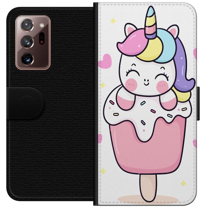 Plånboksfodral för Galaxy Note20 Ultra med Glad enhörning -design. Fodralet kombinerar stil och funktion – ett slitstarkt mobilskal som skyddar mot repor och stötar samt praktiska kortfack på insidan.