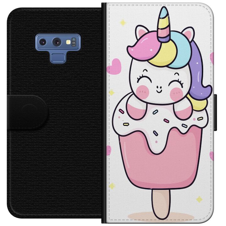 Plånboksfodral för Galaxy Note9 med Glad enhörning -design. Fodralet kombinerar stil och funktion – ett slitstarkt mobilskal som skyddar mot repor och stötar samt praktiska kortfack på insidan.