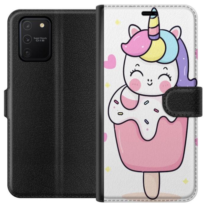 Plånboksfodral för Galaxy S10 Lite med Glad enhörning -design. Fodralet kombinerar stil och funktion – ett slitstarkt mobilskal som skyddar mot repor och stötar samt praktiska kortfack på insidan.