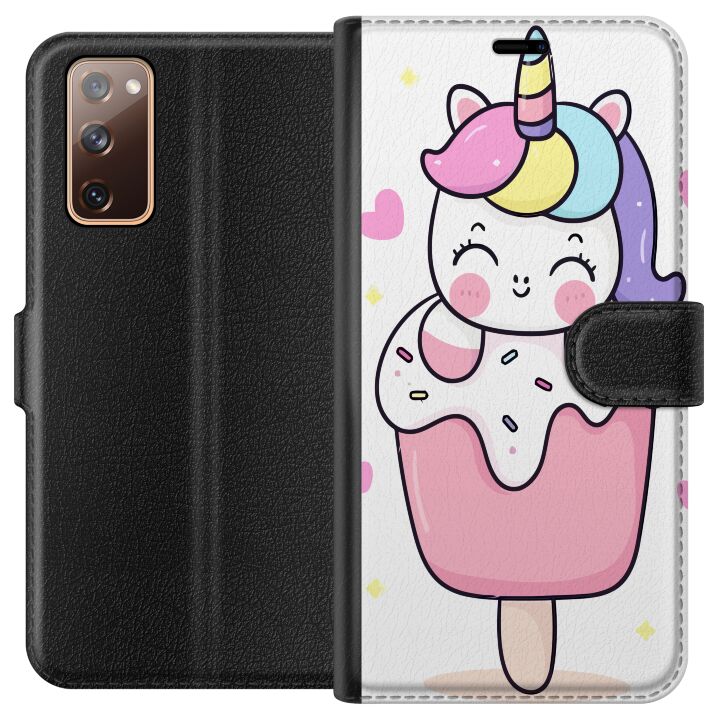 Plånboksfodral för Galaxy S20 FE med Glad enhörning -design. Fodralet kombinerar stil och funktion – ett slitstarkt mobilskal som skyddar mot repor och stötar samt praktiska kortfack på insidan.