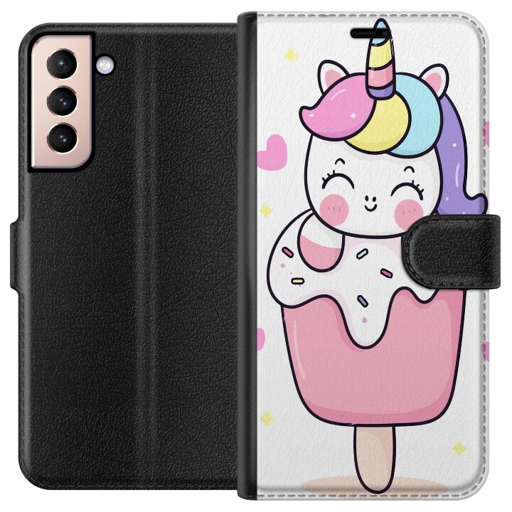 Plånboksfodral för Galaxy S21 med Glad enhörning -design. Fodralet kombinerar stil och funktion – ett slitstarkt mobilskal som skyddar mot repor och stötar samt praktiska kortfack på insidan.