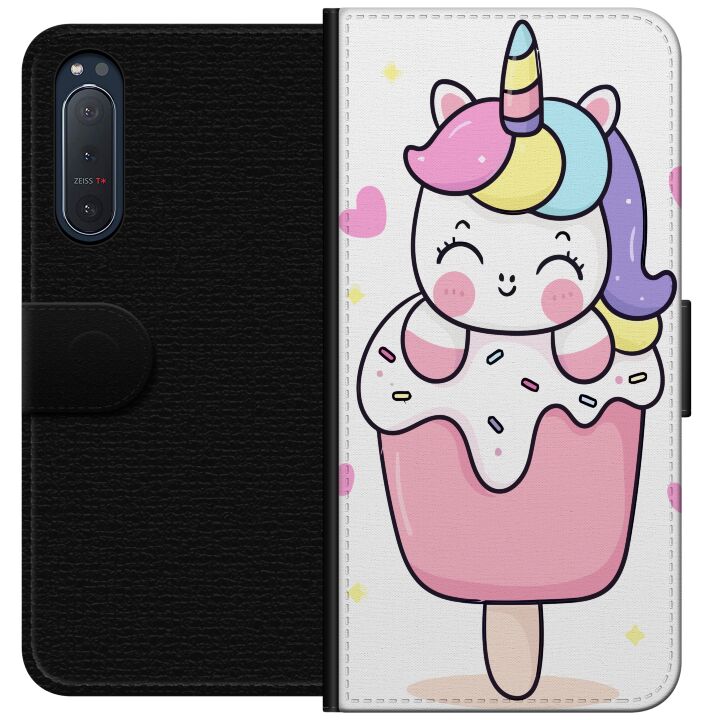 Plånboksfodral för Xperia 5 II med Glad enhörning -design. Fodralet kombinerar stil och funktion – ett slitstarkt mobilskal som skyddar mot repor och stötar samt praktiska kortfack på insidan.