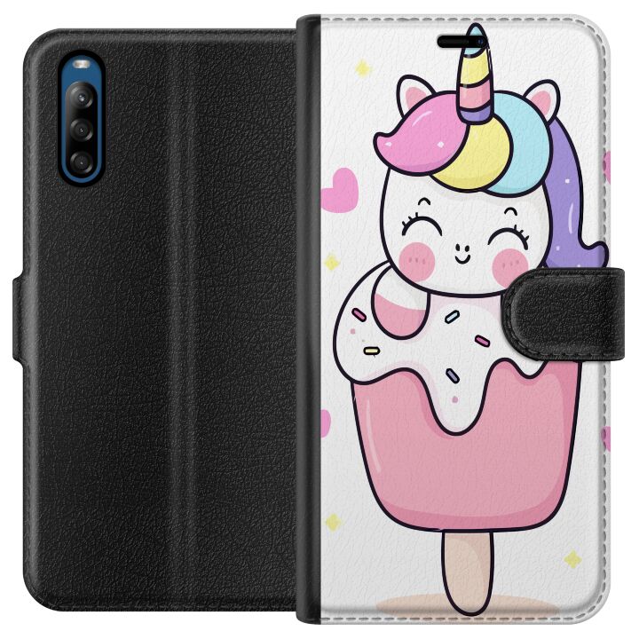 Plånboksfodral för Xperia L4 med Glad enhörning -design. Fodralet kombinerar stil och funktion – ett slitstarkt mobilskal som skyddar mot repor och stötar samt praktiska kortfack på insidan.