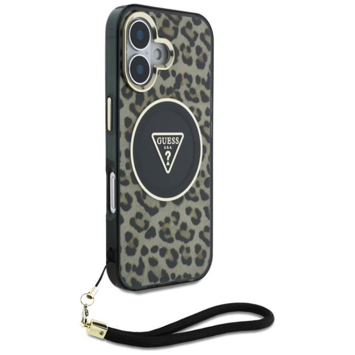 Guess iPhone 16 Mobilskal MagSafe HC IML Leopard Triangle Cord Strap - Brun
