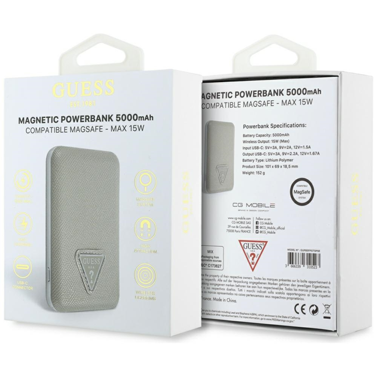 Guess MagSafe Trådlös Power Bank 5000mAh 15W USB-C Grained Triangle Inductive - Beige