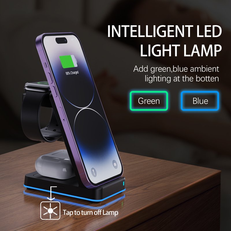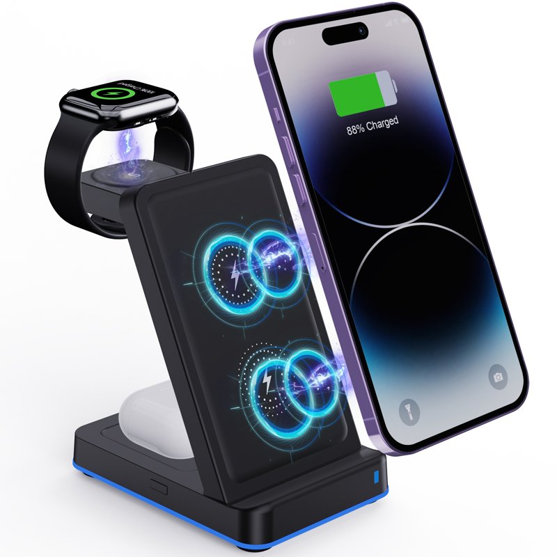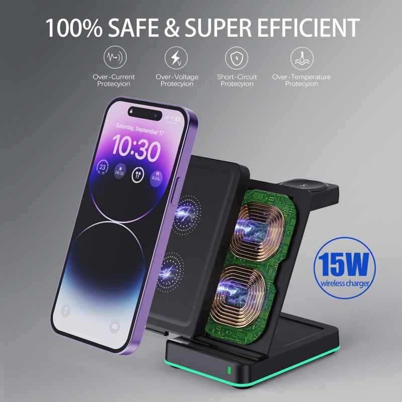 - Trådlös laddning för telefon, hörlurar och klocka i ett