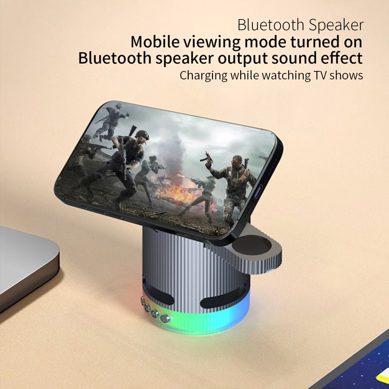 Den trådlösa laddningsdockan erbjuder en effektiv lösning för att ladda din telefon, klocka och hörlurar samtidigt. Med sin kompakta design är den perfekt för resor och har en inbyggd Bluetooth-högtalare med RGB-belysning för en förbättrad ljudupplevelse. Ladda och njut av musik i ett och samma steg.