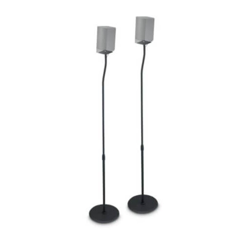 Två höjdjusterbara högtalarstativ för små front eller bakhögtalare i surroundsystem. Halkfri gummiring på basen säkerställer stabilitet och skyddar golvet.