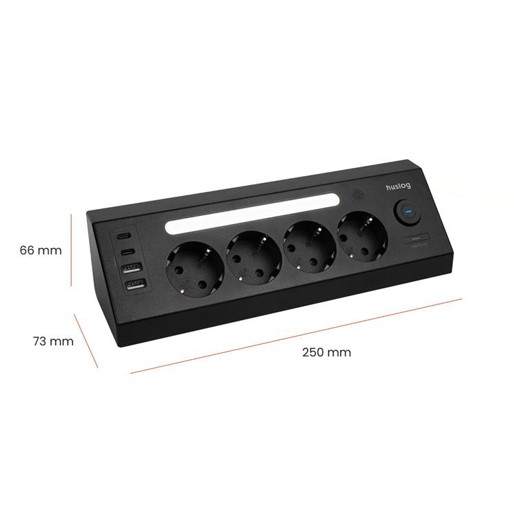 Med 4 Schuko-uttag och 4 USB-portar (2× USB-A + 2× USB-C) kan du enkelt driva och ladda flera enheter samtidigt, från laptops och konsoler till smartphones och surfplattor. Den vertikala designen sparar värdefull yta och gör den idealisk även i små rum.