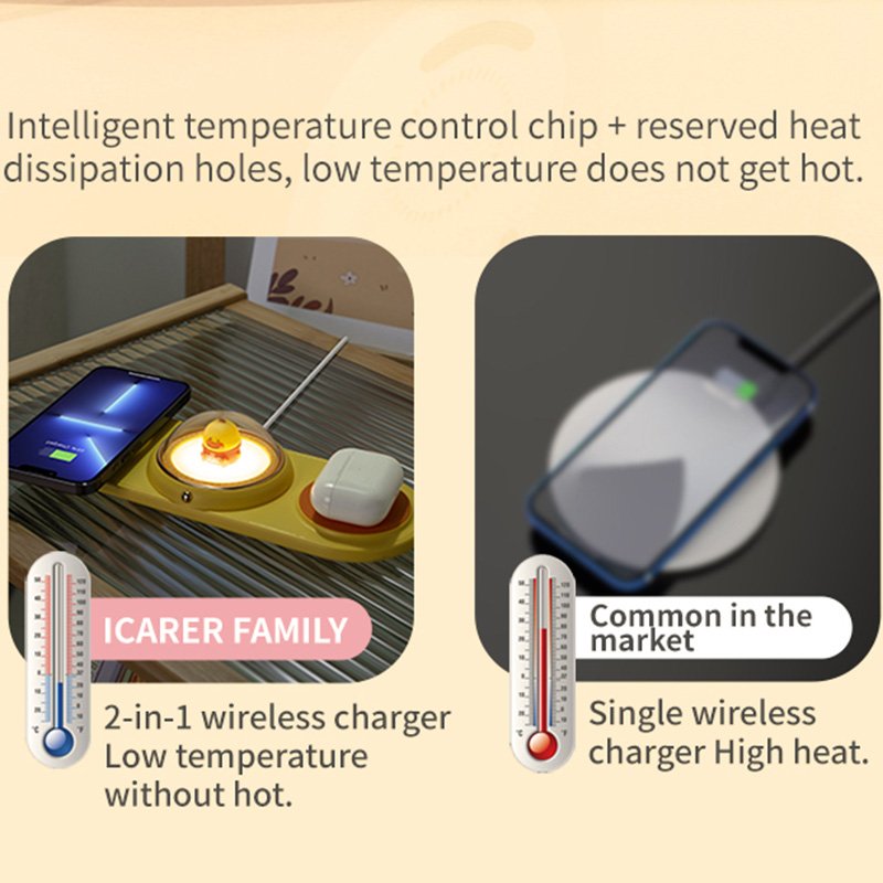 Denna trådlösa laddare erbjuder en total effekt på 20W och kan ladda två enheter samtidigt. Med stark kompatibilitet kan den ladda både mobiltelefoner och hörlurar. Den är designad med en söt karaktärsdekoration och har en användarvänlig tryckknapp för enkel drift.