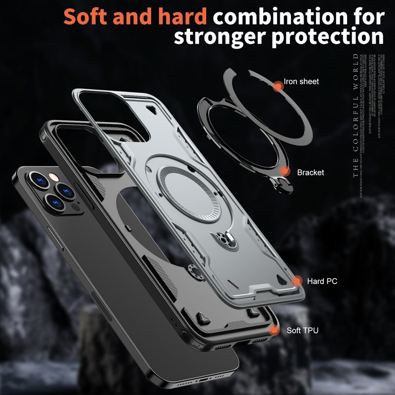 Detta fodral erbjuder militärklassat skydd för din telefon. Tillverkat av hållbara PC- och TPU-material, ger det stöt- och fallskydd. Med en inbyggd kickstand kan du enkelt njuta av handsfree-visning. Fodralet är också kompatibelt med MagSafe-laddare för snabb och säker laddning. Håll din enhet säker och funktionell med detta högkvalitativa fodral.