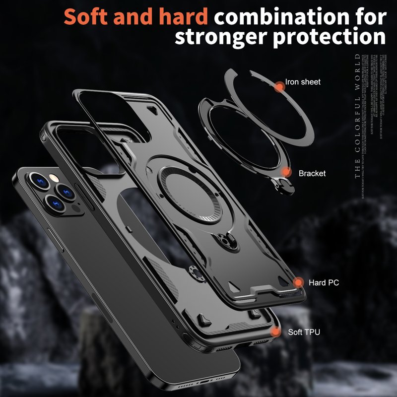 Vårt fodral erbjuder militärklassat skydd för din telefon. Tillverkat av hållbara PC- och TPU-material, skyddar det mot stötar och fall. Med en inbyggd kickstand kan du enkelt njuta av handsfree-visning. Fodralet är också kompatibelt med MagSafe-laddare för snabb och säker laddning.