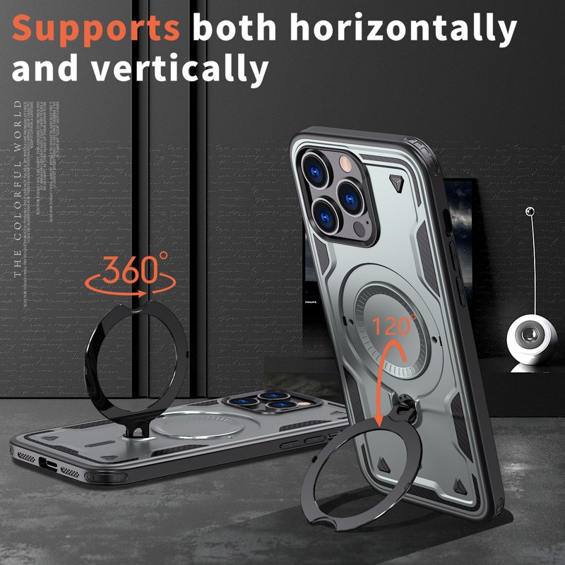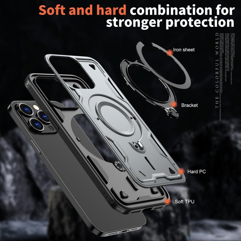 Vårt fodral erbjuder militärklassad skydd för din telefon. Tillverkat av hållbara PC- och TPU-material, ger det stöt- och fallskydd. Med en inbyggd kickstand kan du enkelt njuta av handsfree-visning. Fodralet är också kompatibelt med MagSafe-laddare för snabb och säker laddning. Skydda din enhet med stil och funktionalitet.