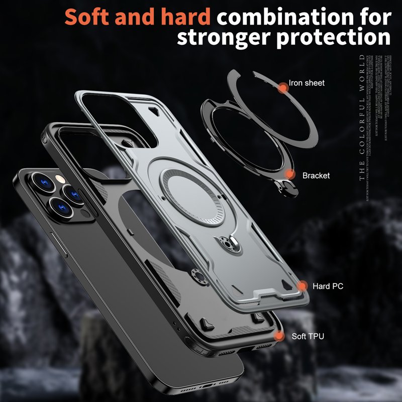 Vårt telefonfodral erbjuder militärklassat skydd för din enhet. Tillverkat av hållbara PC- och TPU-material, ger det stöt- och fallskydd. Med en 360-graders roterande kickstand kan du enkelt njuta av handsfree-visning. Fodralet är också kompatibelt med MagSafe-laddare för snabb och säker laddning.