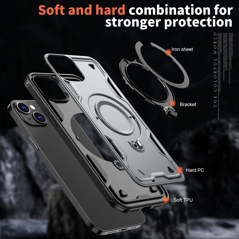 Detta fodral erbjuder militärklassad skydd för din enhet. Tillverkat av hållbara PC- och TPU-material, ger det stöt- och fallskydd. Med en 360-graders roterande kickstand kan du enkelt njuta av handsfree-visning. Fodralet är också kompatibelt med MagSafe-laddare för snabb och säker laddning.