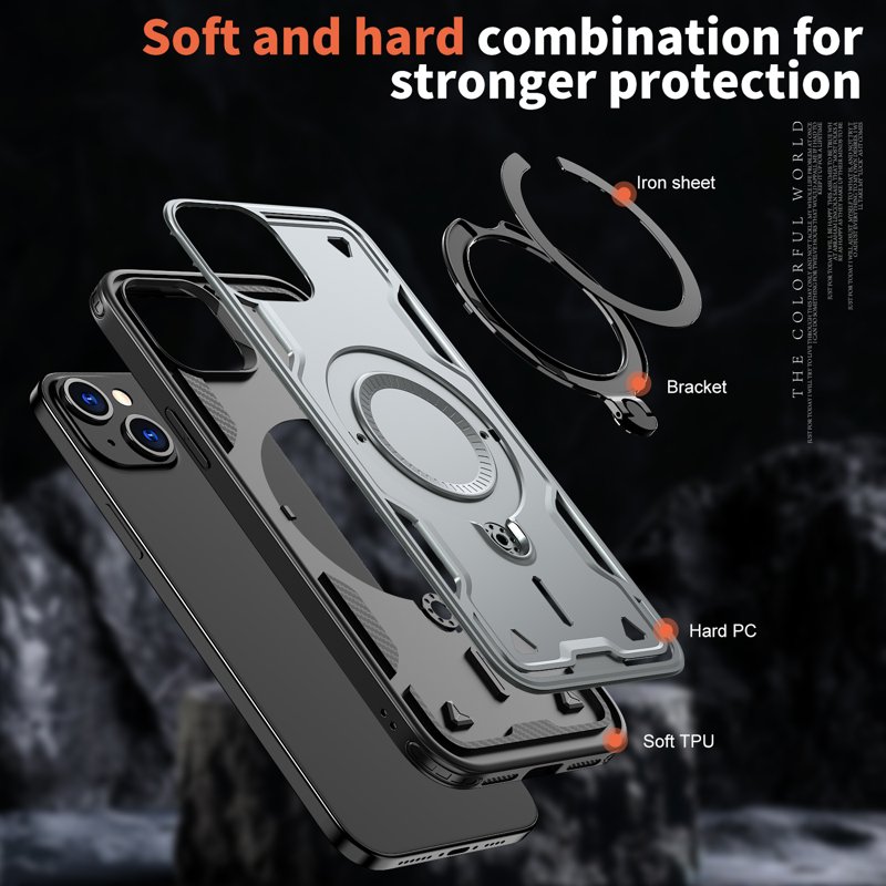 Detta fodral erbjuder militärklassat skydd för din enhet. Tillverkat av hållbara PC- och TPU-material, ger det stöt- och fallskydd. Med en 360-graders roterande kickstand kan du enkelt njuta av handsfree-visning. Fodralet är också kompatibelt med MagSafe-laddare för snabb och säker laddning.