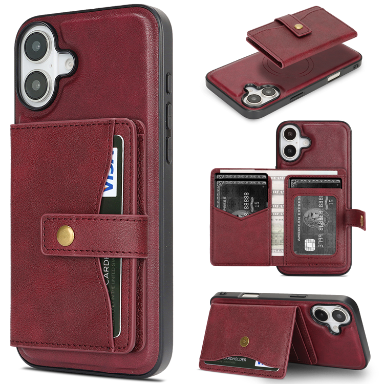 iPhone 16 Mobilskal MagSafe Kickstand Detachable Korthållare PU Läder Coated TPU - Röd