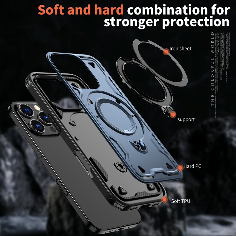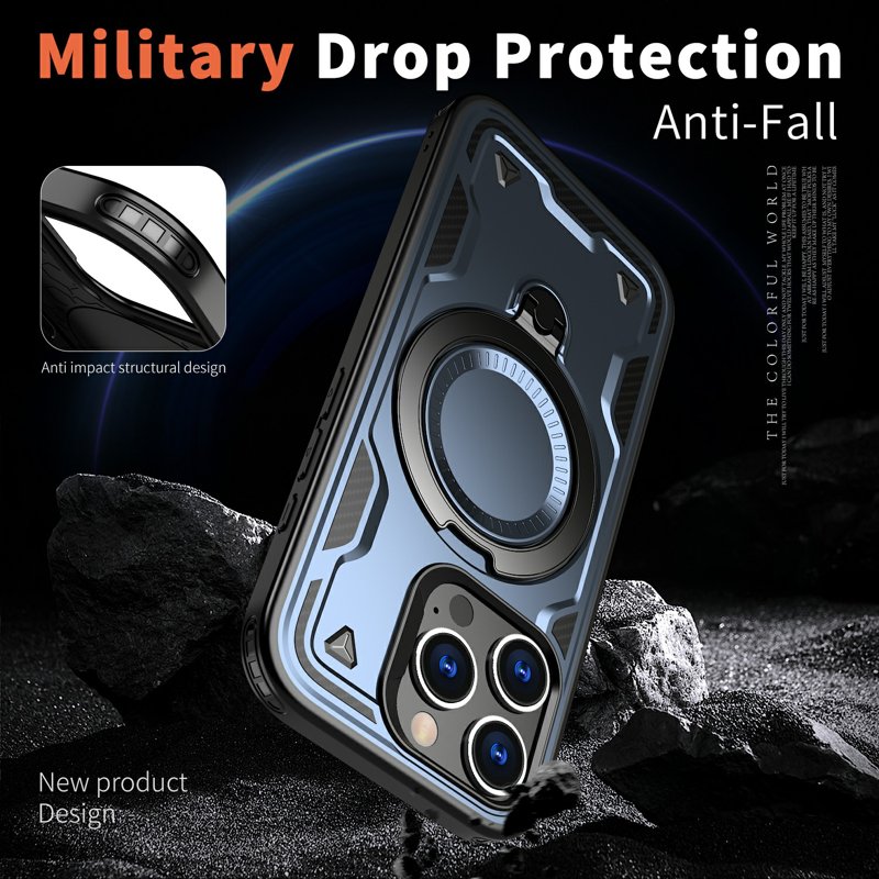 Detta fodral erbjuder militärklassat skydd för din enhet. Tillverkat av hållbara PC- och TPU-material, ger det chockresistent och stöttåligt skydd. Med en 360-graders roterande kickstand kan du enkelt njuta av handsfree-visning. Fodralet är också kompatibelt med MagSafe-laddare för snabb och säker laddning.