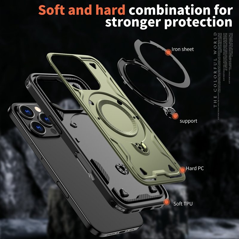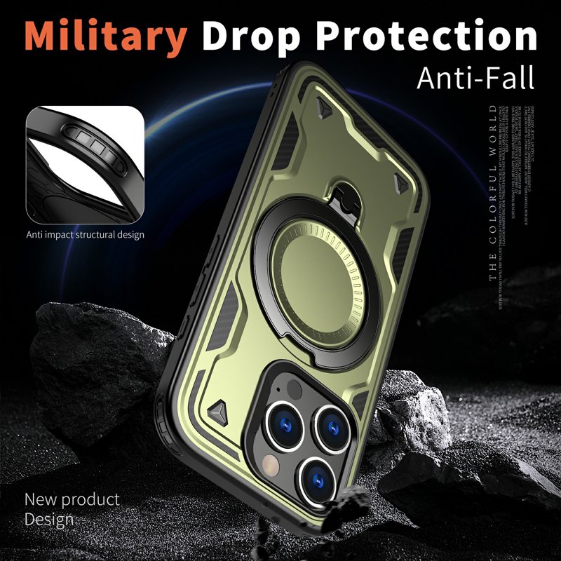 Detta telefonfodral erbjuder militärklassad skydd för din enhet. Tillverkat av hållbara PC- och TPU-material, ger det stöt- och fallskydd. Med en inbyggd kickstand kan du enkelt njuta av handsfree-visning. Fodralet är också kompatibelt med MagSafe-laddare för snabb och säker laddning. Håll din telefon säker och funktionell med detta högkvalitativa fodral.