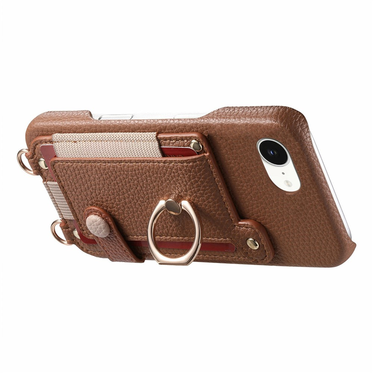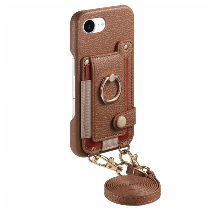 iPhone 16e Mobilskal med Korthållare och Axelrem Ring Kickstand Läder + PC - Brun