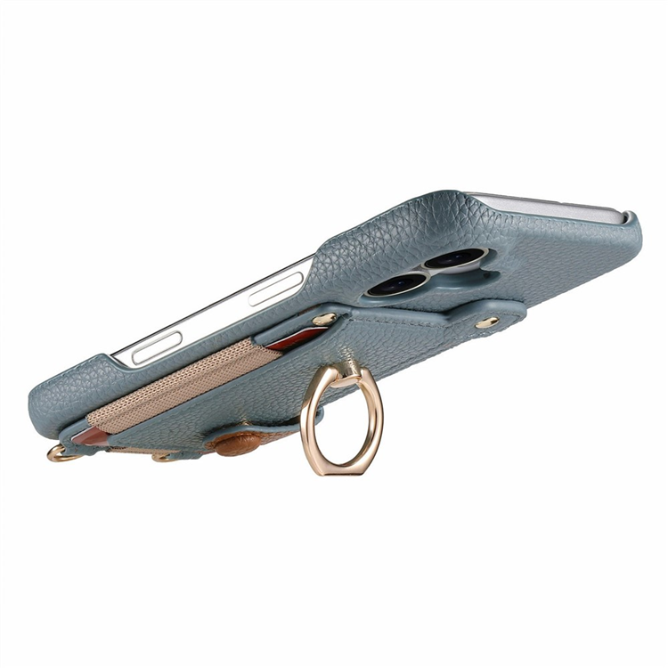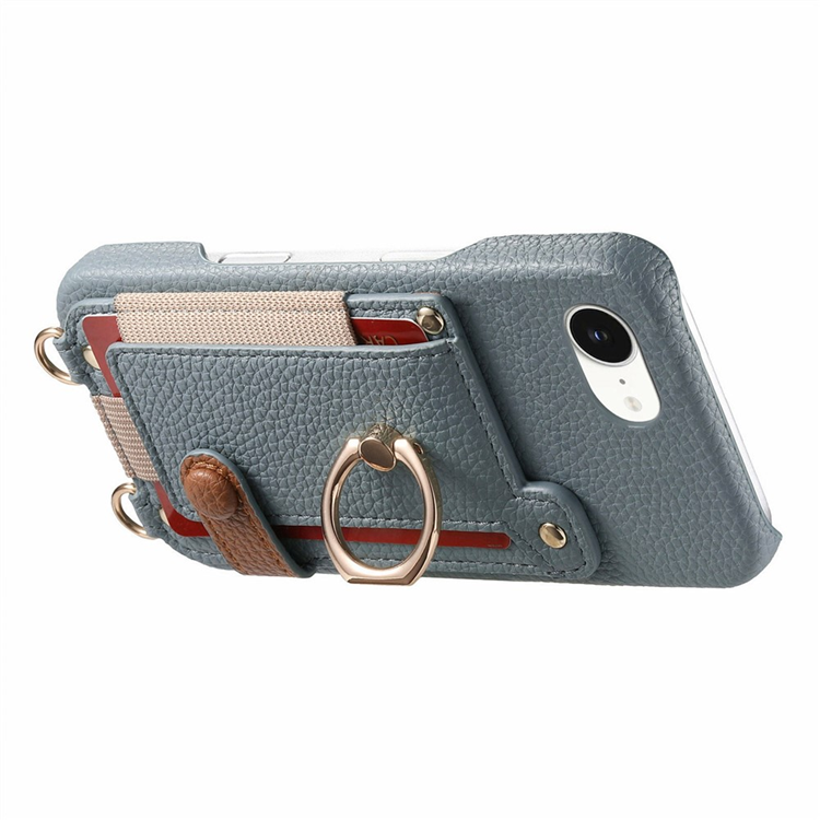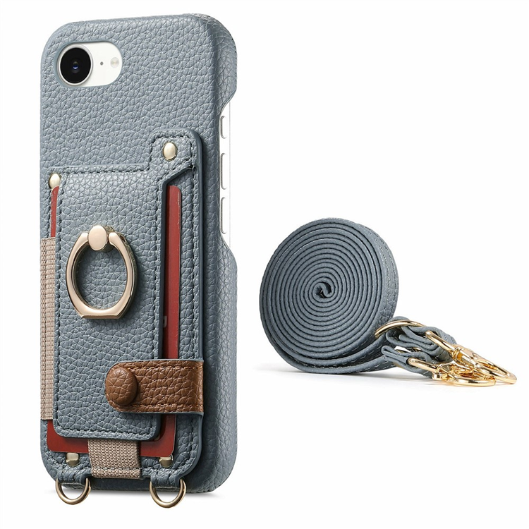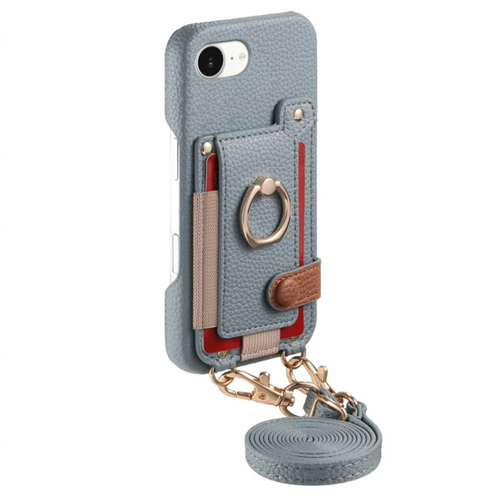 iPhone 16e Mobilskal med Korthållare och Axelrem Ring Kickstand Läder + PC - Himmelsblå