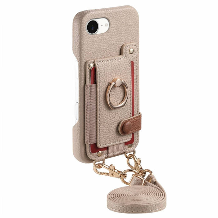 iPhone 16e Mobilskal med Korthållare och Axelrem Ring Kickstand Läder + PC - Khaki