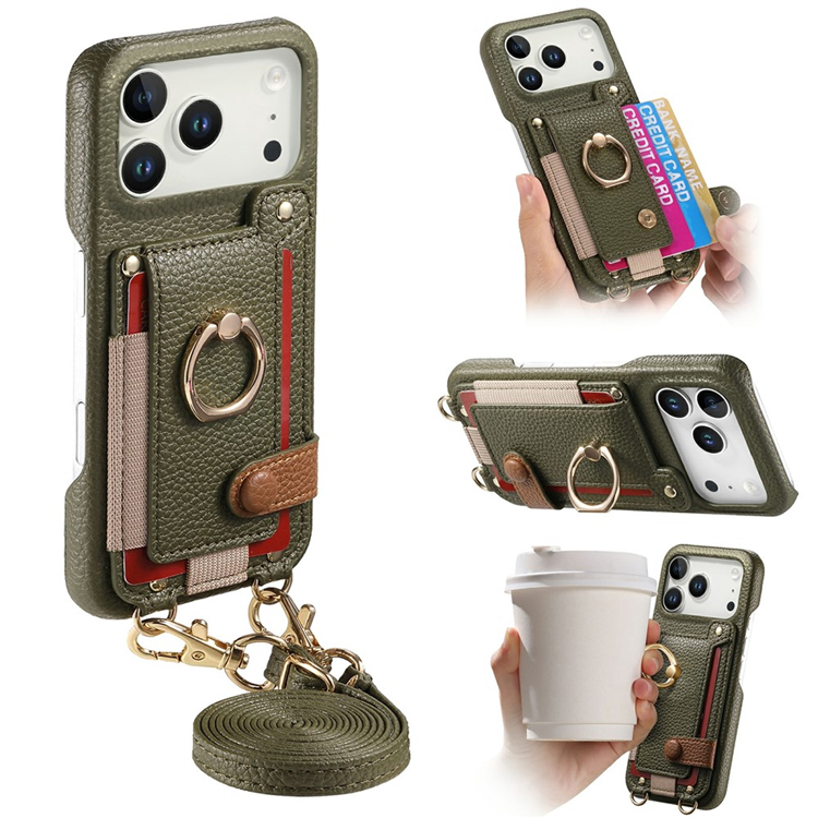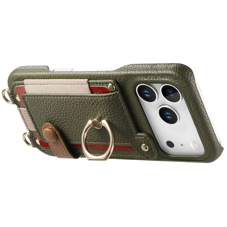 iPhone 17 Pro Mobilskal med Korthållare och Axelrem Ring Kickstand Läder - Midnight Grön