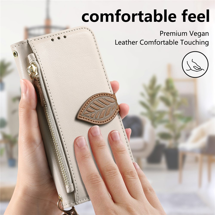 iPhone 17 Plånboksfodral med Handrem Leaf Shape Magnetiskt Spänne Läder - Beige