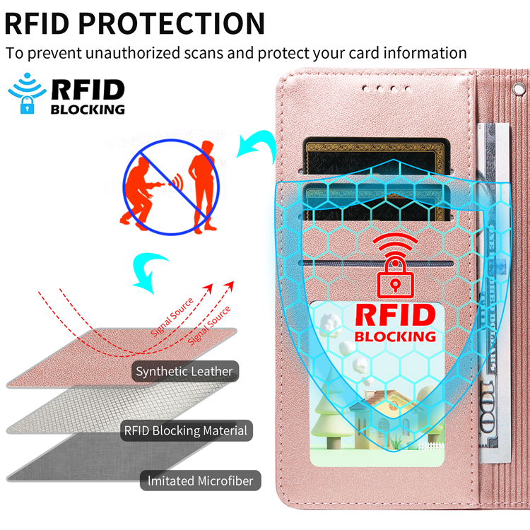 Detta mobilskal är inte bara snyggt, utan också praktiskt. Med tre kortfack och ett kontantfack fungerar det som en smidig plånbok, medan den magnetiska knäppningen håller dina tillhörigheter säkra. RFID-skyddet ser dessutom till att dina kort är skyddade från elektronisk stöld. Den inbyggda ställfunktionen gör det enkelt att titta på filmer eller videosamtala handsfree, och den avtagbara handledsremmen gör skalet lätt att bära med sig överallt.