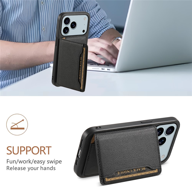 iPhone 17 Pro Max Mobilskal Korthållare Calf Texture Kickstand Läder - Svart