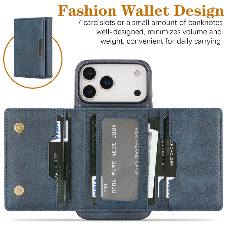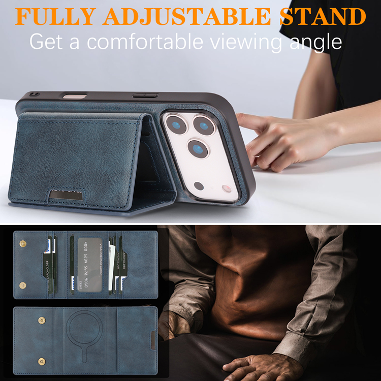 iPhone 17 Pro Max Mobilskal MagSafe Kickstand Tri-fold Korthållare PU Läder Coated TPU - Blå
