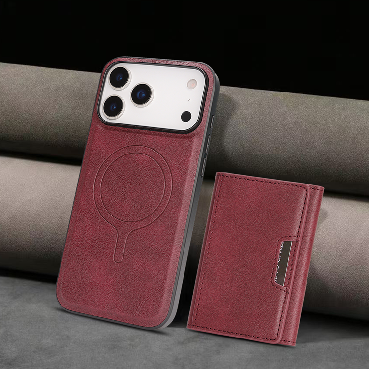 iPhone 17 Pro Max Mobilskal MagSafe Kickstand Tri-fold Korthållare PU Läder Coated TPU - Röd