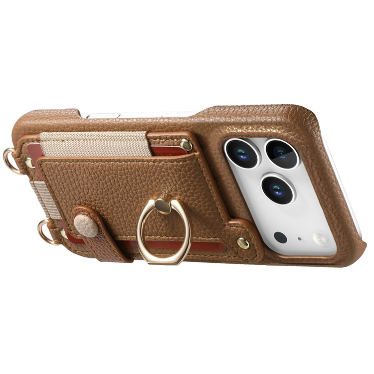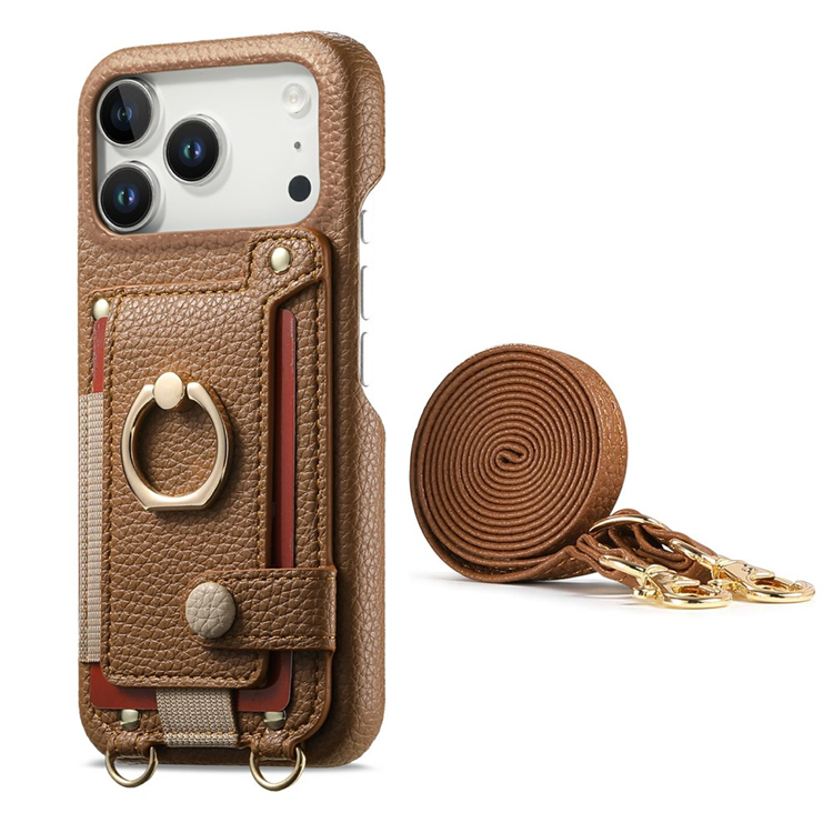 iPhone 17 Pro Max Mobilskal med Korthållare och Axelrem Ring Kickstand Läder + PC - Brun