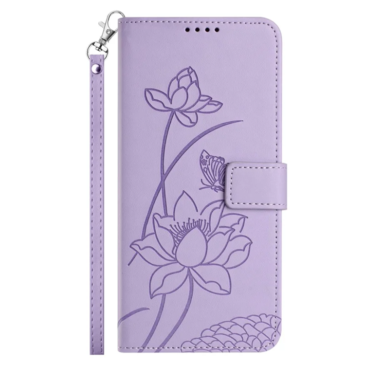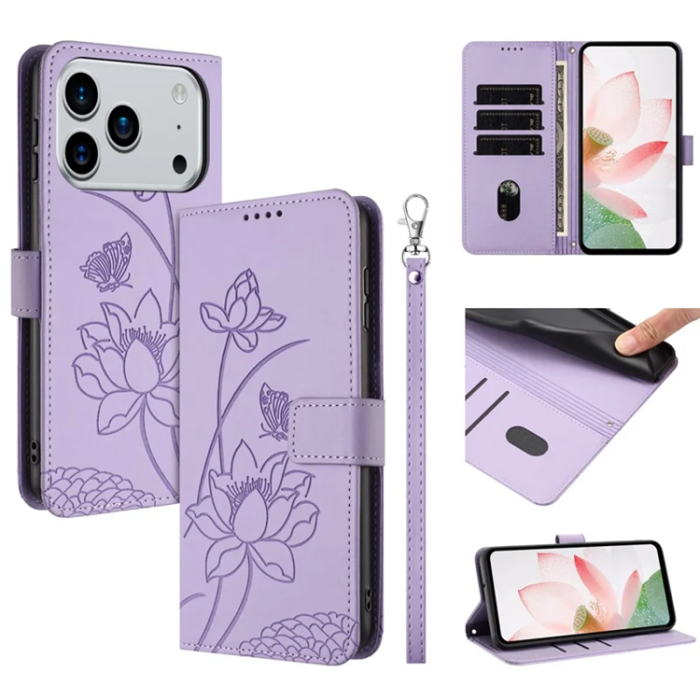 iPhone 17 Pro Max Plånboksfodral Lotus Imprint Läder med Strap - Lila