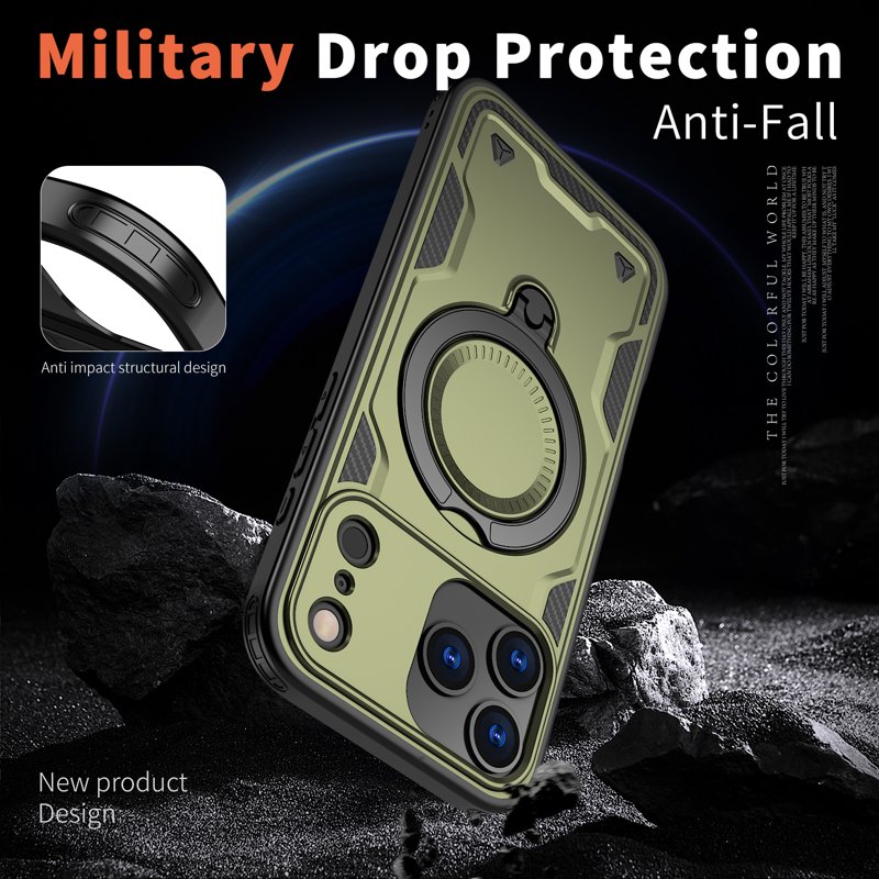 Vårt telefonfodral erbjuder militärklassat skydd för din enhet. Tillverkat av hållbara PC- och TPU-material, ger det stöt- och fallskydd. Med en inbyggd kickstand kan du enkelt njuta av handsfree-visning. Fodralet är också kompatibelt med MagSafe-laddare för snabb och säker laddning.